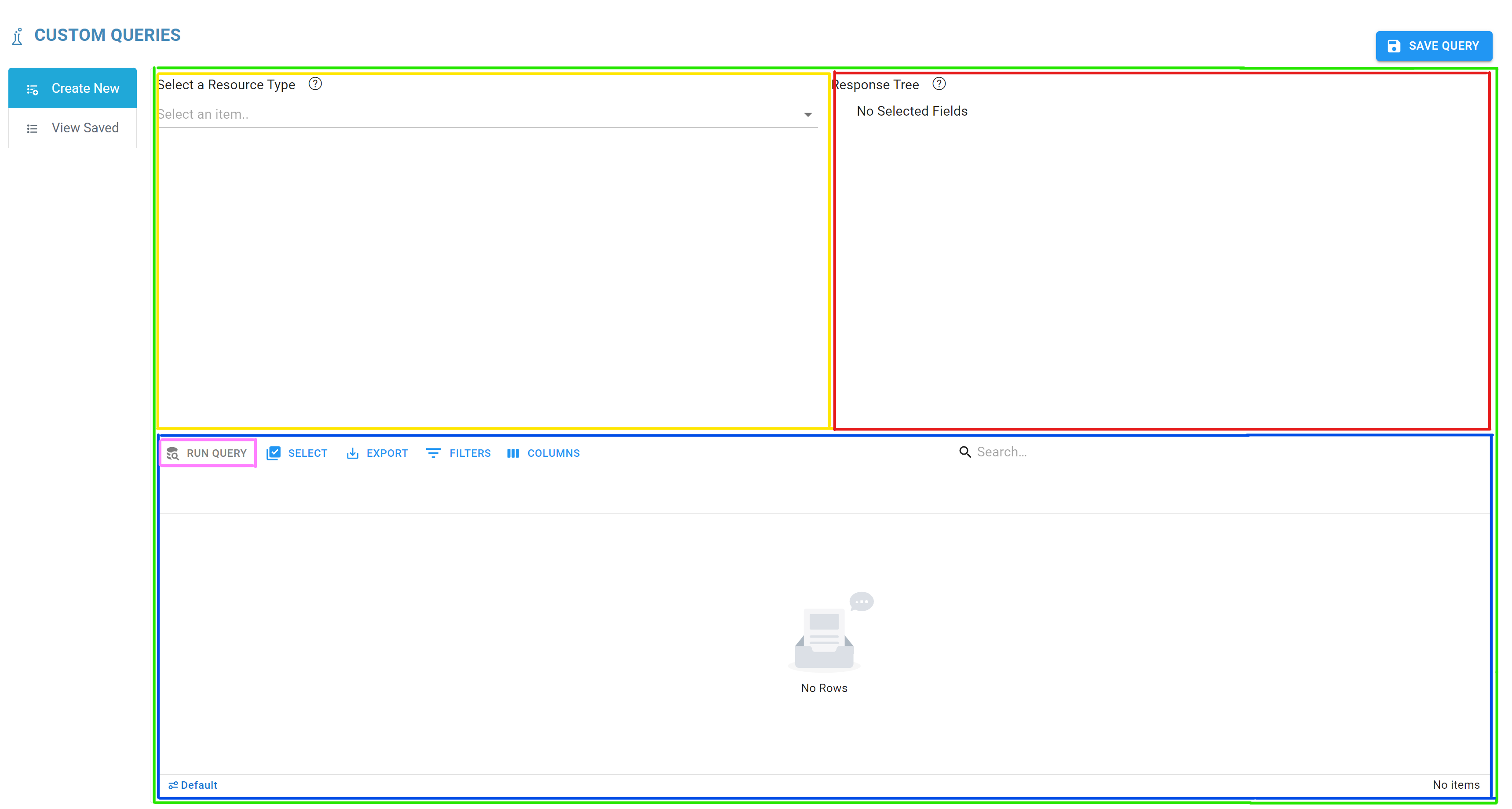 Yellow - This is the field selection UI, here you can choose the data that is retrieved by the query