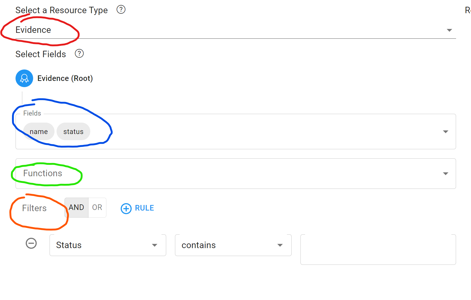 Red - At the top of the field selector is a drop down where you can indicate the root resource which is being queried