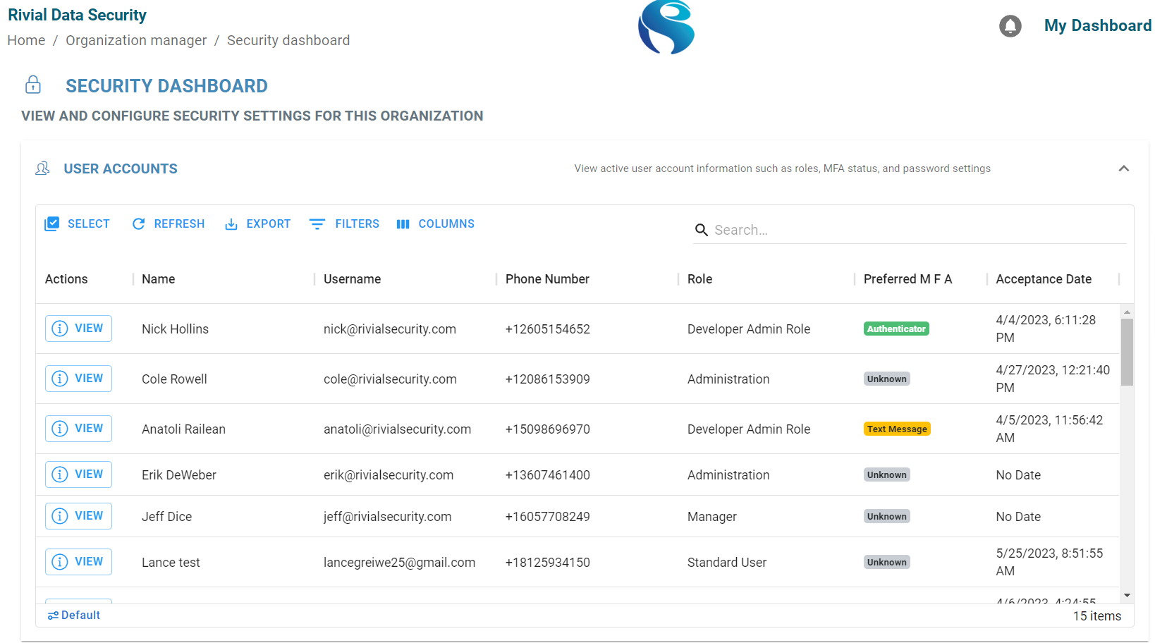 The Security Dashboard allows organizations to see user accounts information and MFA status. From this dashboard, an admin or manager can change Multi-Factor Authentication settings to require or make it optional for users to set up MFA.