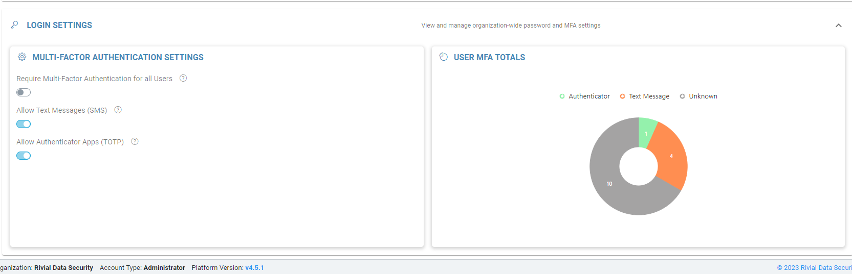 The login settings on the security dashboard allows organizations to require or not require users to set up MFA on the Rivial Platform. By default, users are able to use Text Message (SMS) or Authenticator Apps (TOTP) to setup MFA. The User MFA Totals display a chart showing the number of users who use each MFA tool.