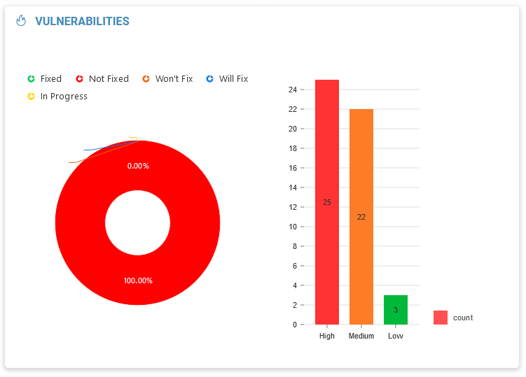 The Vulnerabilities graph widget displays two info graphs. The pie chart displays the status of all Vulnerabilities in an Organization. The bar graph displays the number of each priority level.
